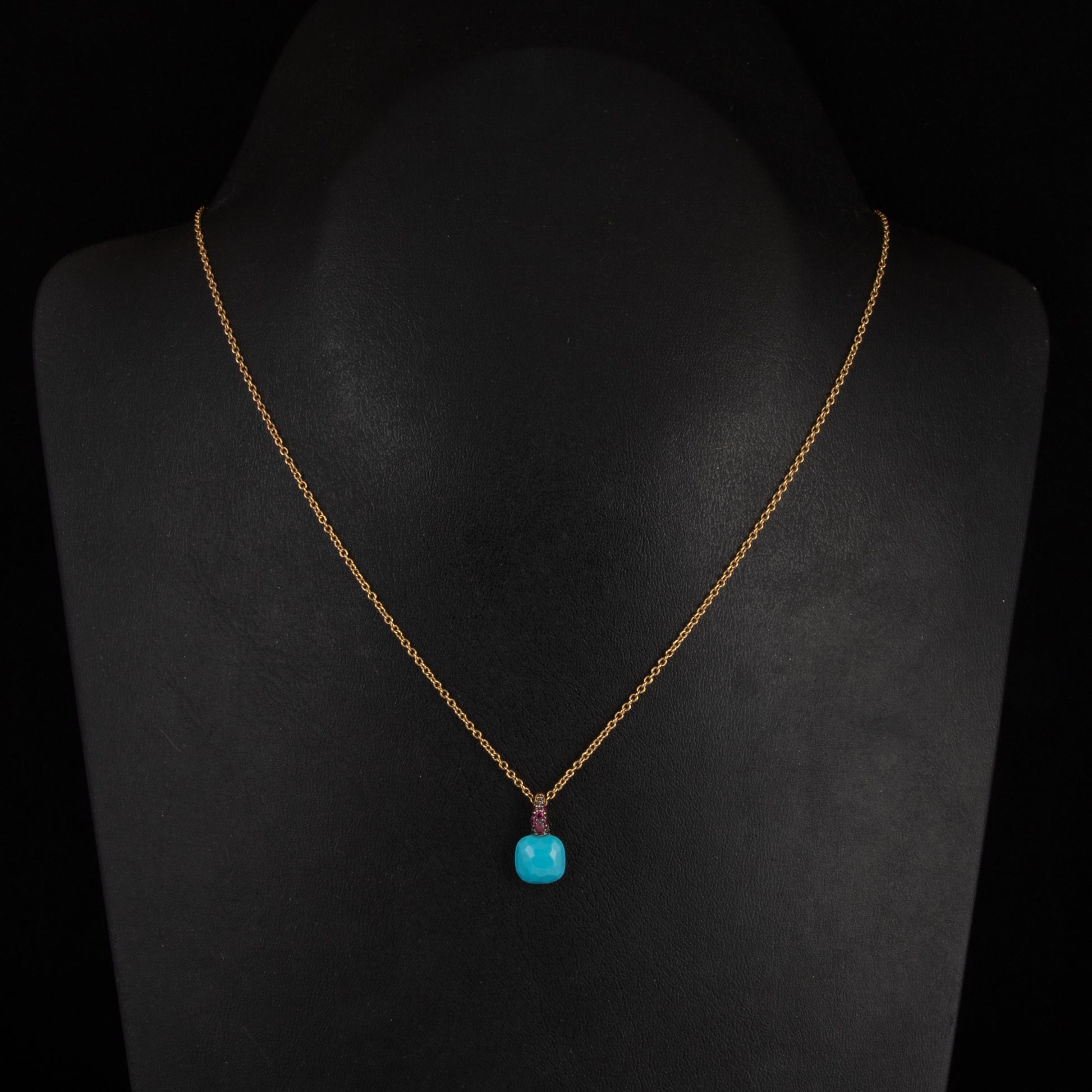 Colgante Pomellato con cadena oro amarillo, rubís y turquesa facetada.