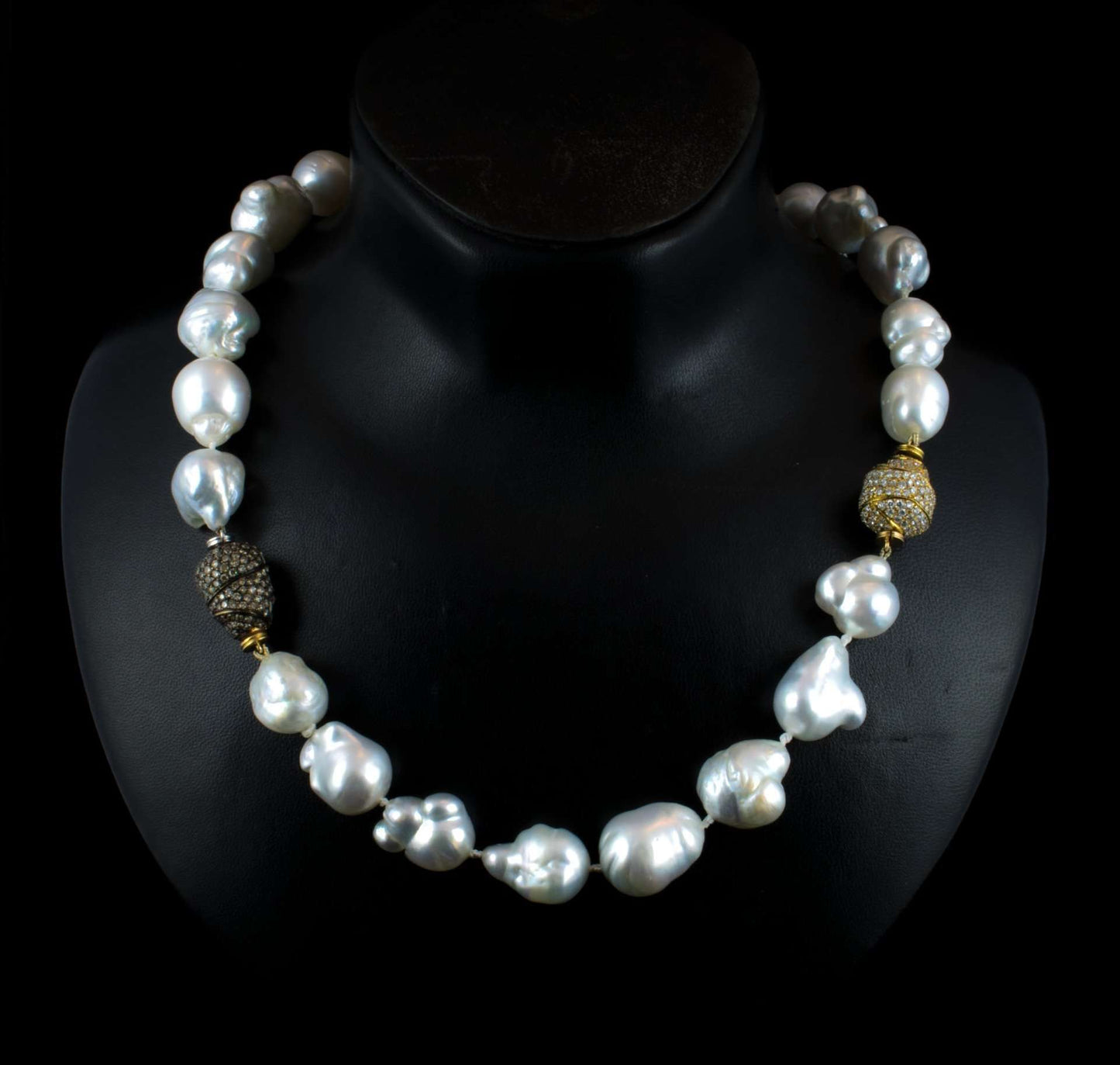 Collar de perlas barrocas con 3 cierres en 0a y brillante blancos 2,4 ct, brillantes negros 2,4 ct. Perlas de 15 x 13,6 mm a 21 x 15 mm.