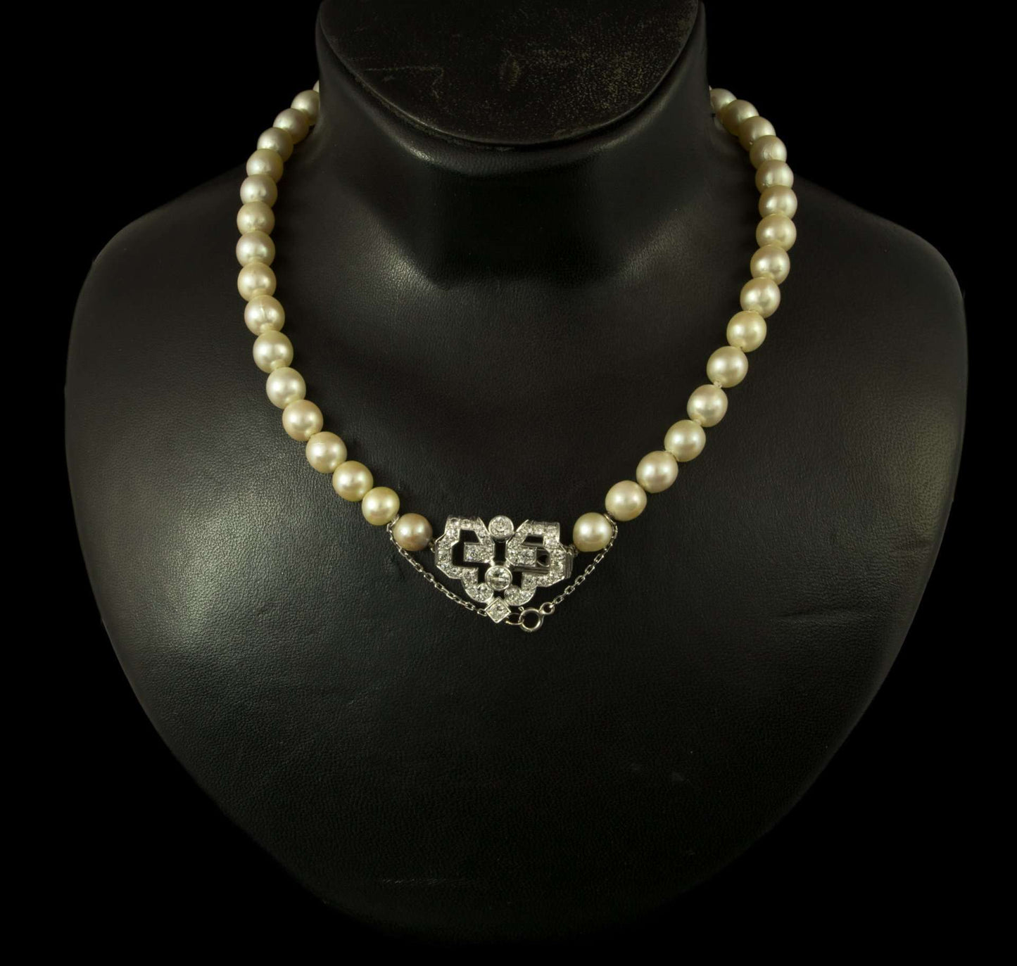 Collar de perlas cultivadas con cierre en oro blanco con brillantes talla antigua 2 de 0,32 y resto de 1,64 cts. de finales años 30.