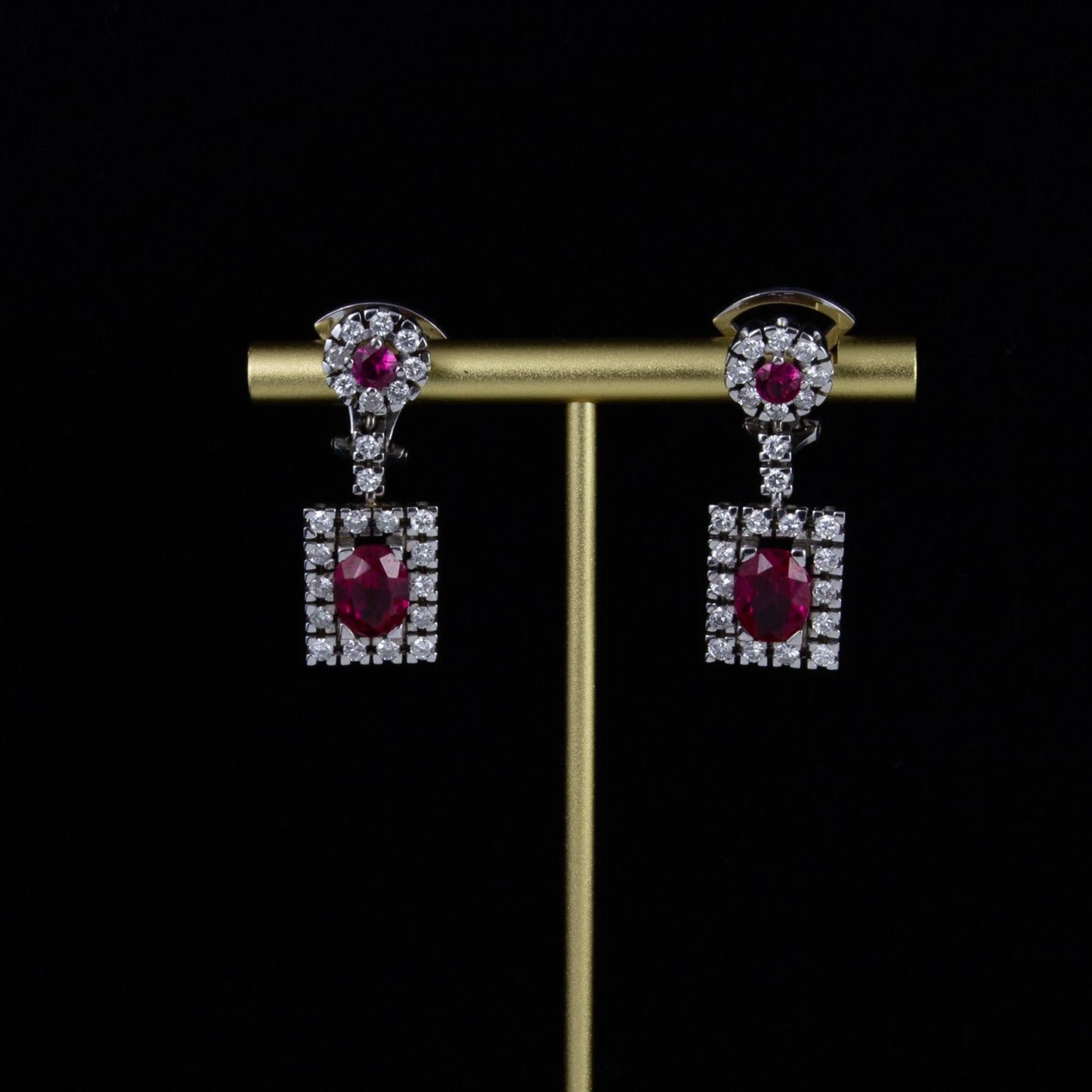 Pendientes en oro blanco y diamantes con rubí sintético.