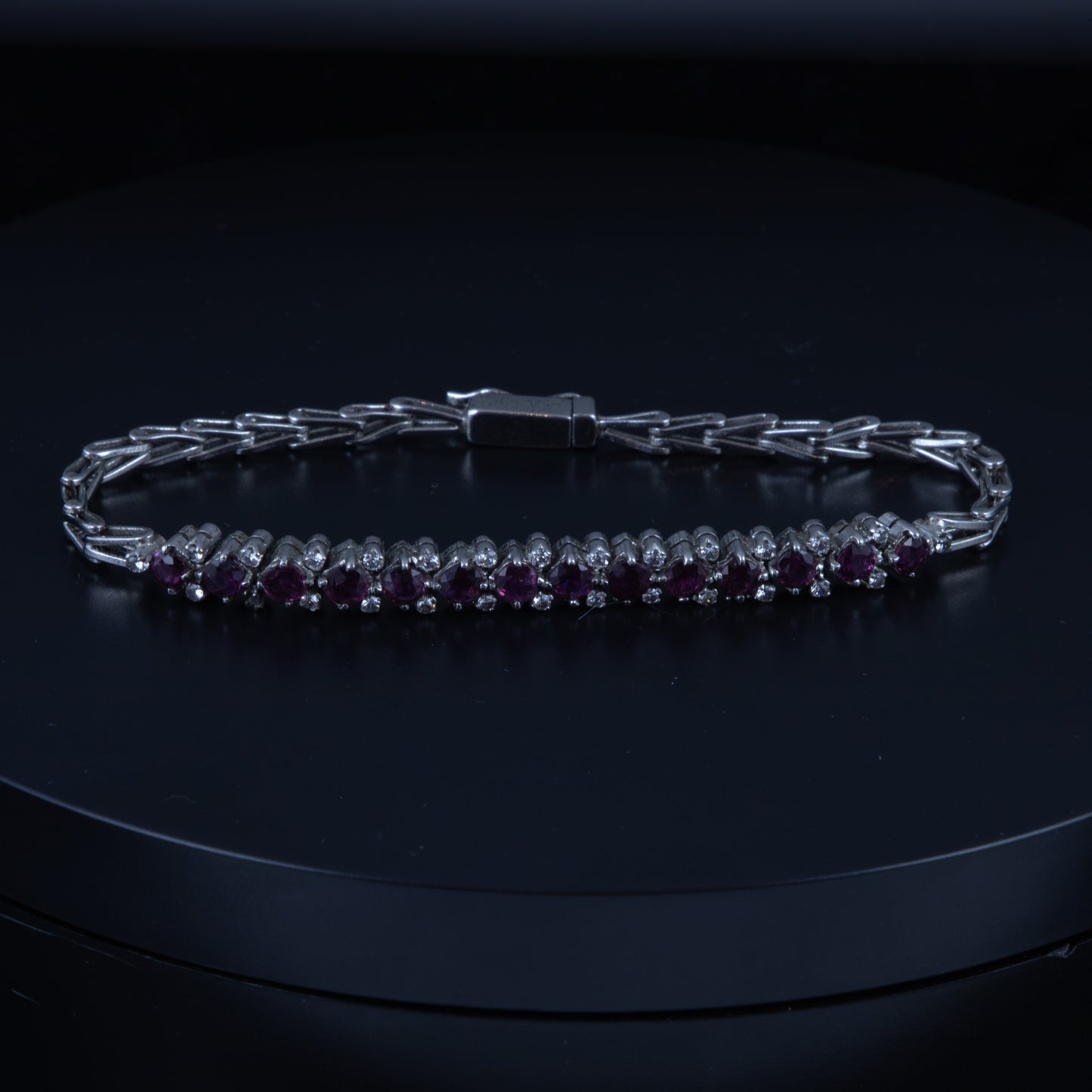 Pulsera combinada en oro blanco y rubies talla brillante, 0,11 x 14 con un total de 1,54 qts y diamantes talla brillante 28 x 0,03 qts. con un total de 0,84 qts.