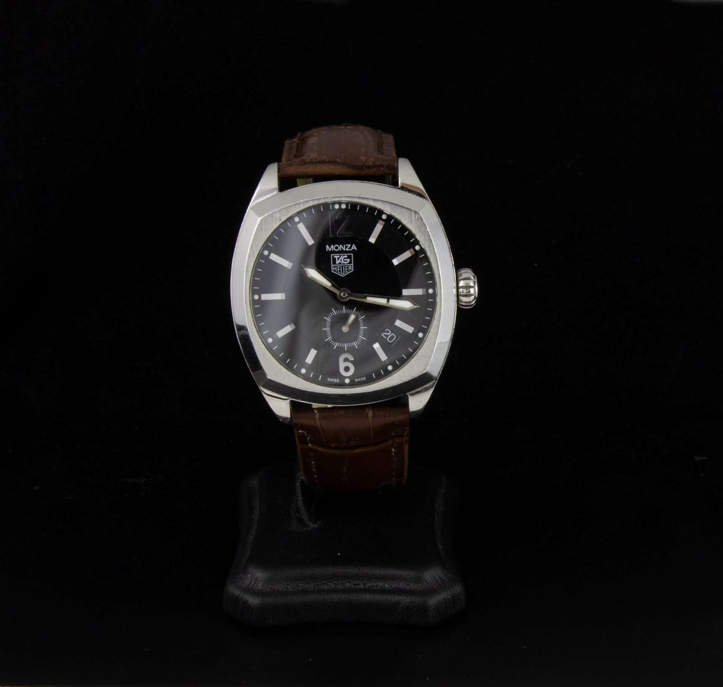 Reloj TAG Heuer Monza, automático con esfera negra y correa de piel.