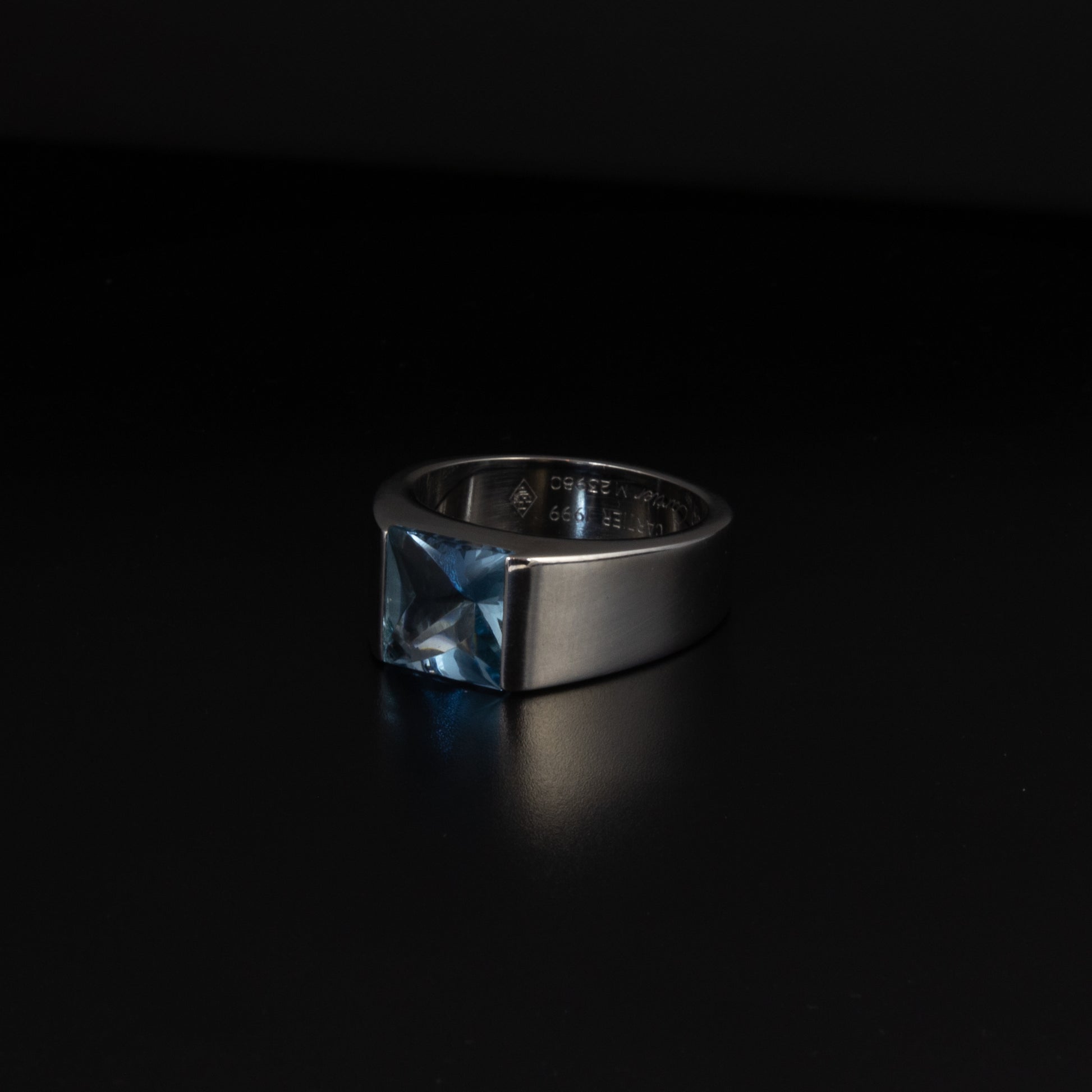 Este anillo sello Cartier Tank está elaborado en oro blanco de 18 quilates, con un diseño geométrico y robusto inspirado en las líneas del legendario reloj Tank de Cartier. Su estructura sólida y de perfil angular se complementa con una aguamarina talla cuadrada de un azul cristalino, engastada en un ajuste de bisel que realza su pureza y brillo sin necesidad de garras.